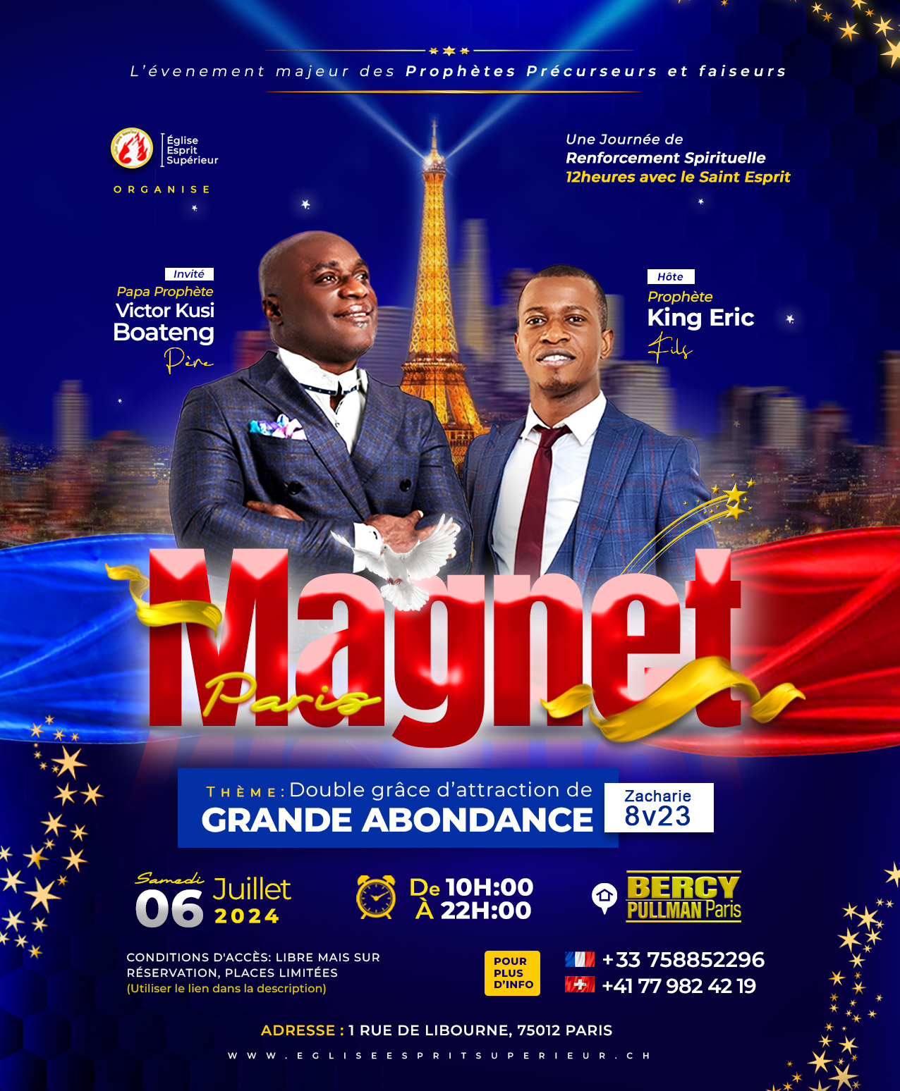 Sa Mega-Conférence, “Magnet Paris”, propose un accès à un espace privé pour un suivi personnalisé selon besoins, et un accès à la plateforme de ses partenaires bénéficiant de formations comprenant des modules vidéo sur une application mobile et web nommée « Esprit Sage », des sessions de coaching téléphoniques, et autres. Ce programme est conçu pour aider les participants à travers toutes les étapes nécessaires pour réussir dans un monde où le mal est appelé bien et le bien est appelé mal; en exploitant le pouvoir de l’enseignement, des actions prophétiques et de l’impactation.